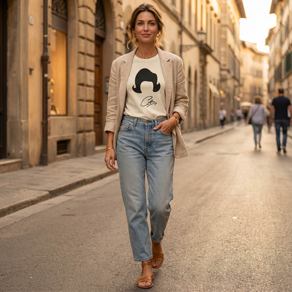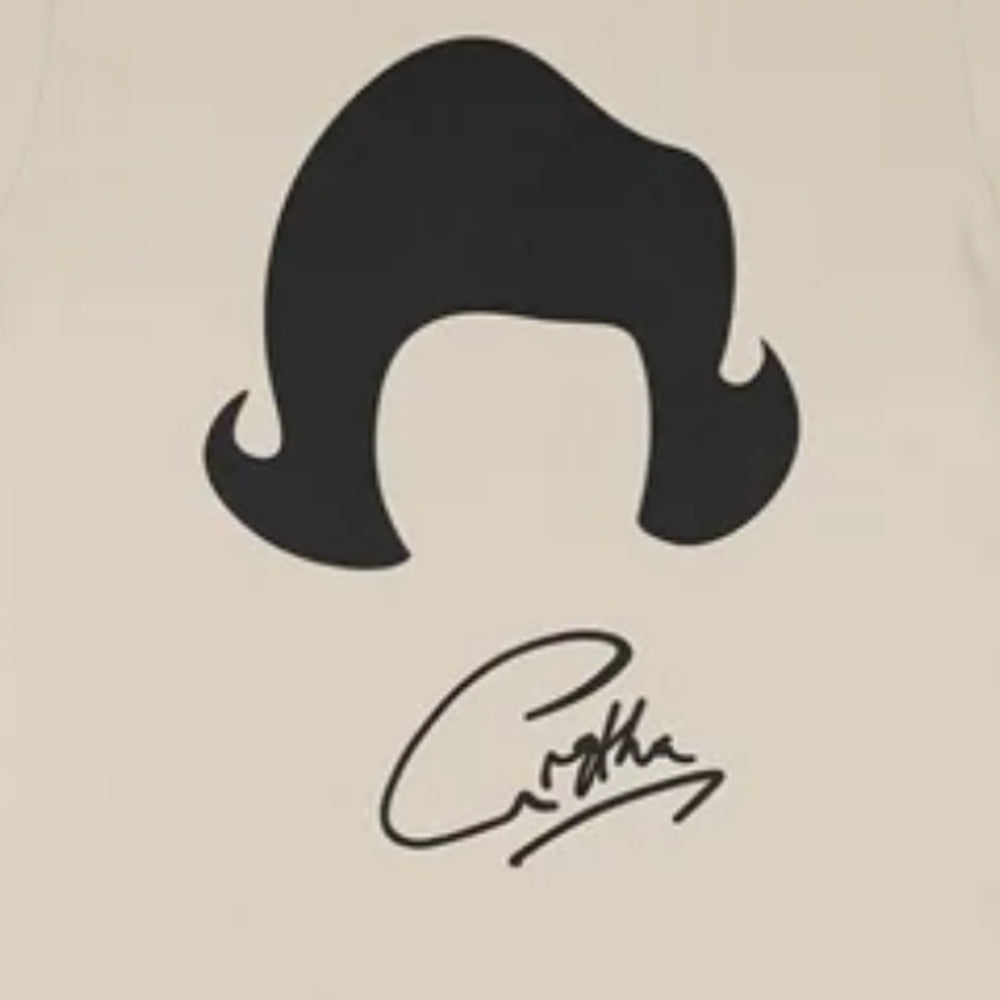 特徴的なヘアスタイルを大胆にシルエット化し、サイン風ロゴを添えたシンプルなデザインは、彼女の圧倒的な存在感を“余白”で語る一枚。