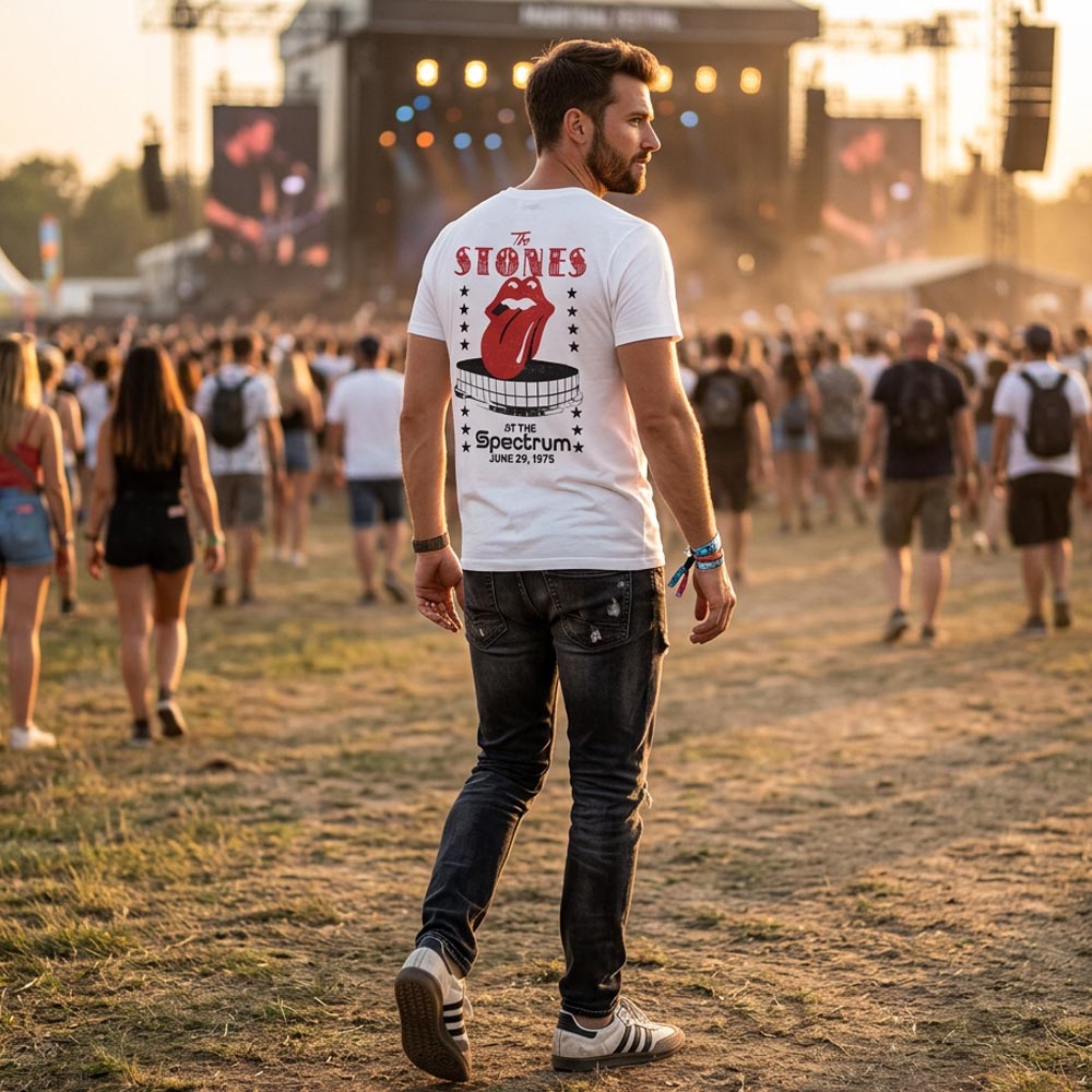 フロントにはイーグルとリップス&タンを組み合わせたグラフィックを配置し、アメリカンロックのダイナミズムを表現。バックには会場名「The Spectrum」と日付を配し、当時のライブの臨場感を感じさせる仕上がりとなっています。