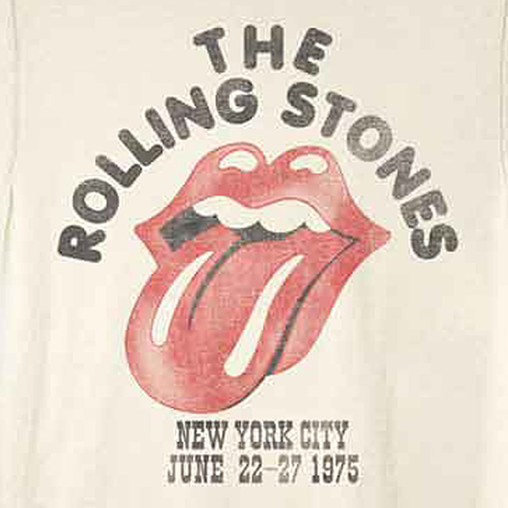 フロントには、ストーンズを象徴する“リップ&タン”ロゴとNEW YORK CITY / JUNE 22-27, 1975 の文字を大胆に配置。