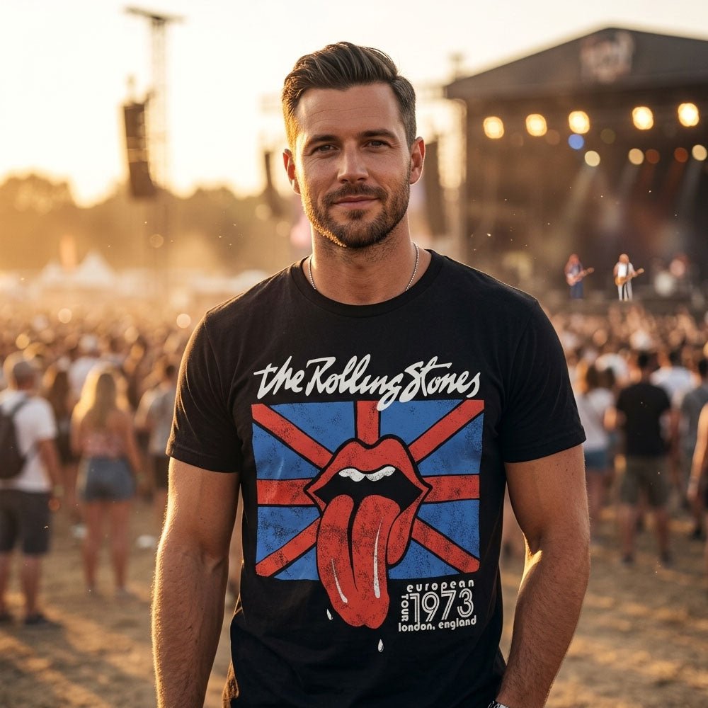 フロントにはアイコニックなリップス&タンとユニオンジャックを大胆に配置し、ストーンズの象徴性を強く打ち出したデザイン。